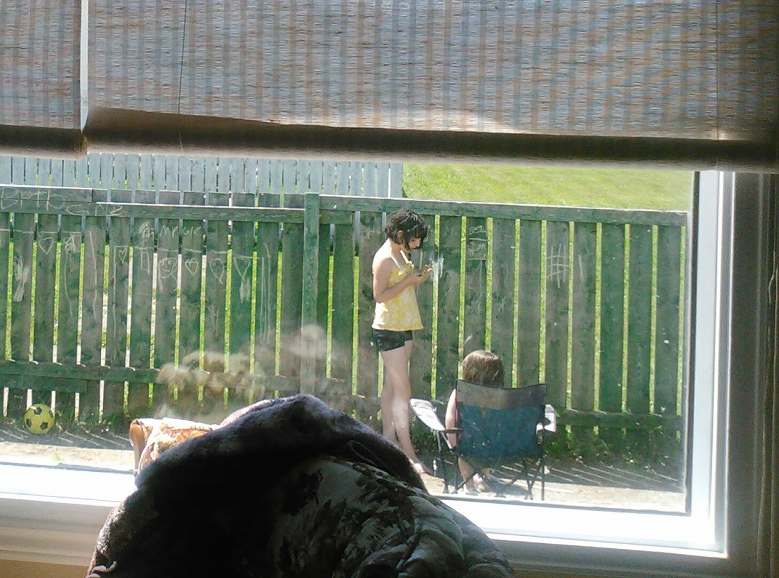 In this one, you can see the reflection of the chair in the window and the vertical lines of the fence as well as my kids playing in the yard.